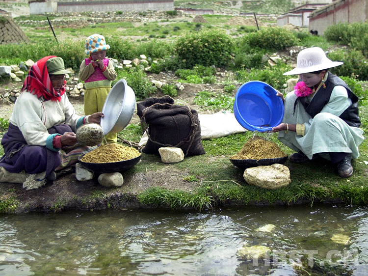 這是尼瑪縣文部鄉(xiāng)南村的藏族婦女在淘洗準(zhǔn)備磨糌粑的青稞(唐召明2001年7月11日攝)