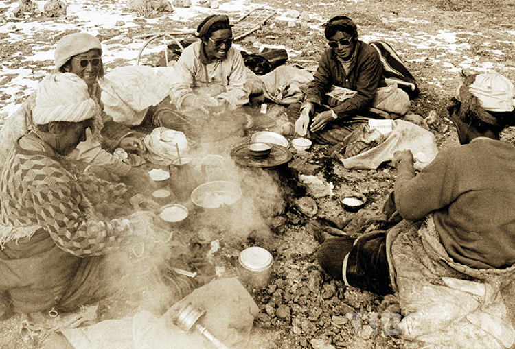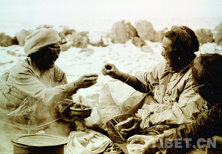 這是在班戈縣納木錯(cuò)湖邊煮茶、抓糌粑、禮讓糌粑的藏北牧人(唐召明1991年攝)