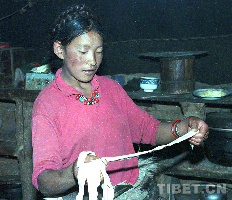 這是班戈縣一牧女正在制作“啦啦”奶酪(唐召明1987年攝)