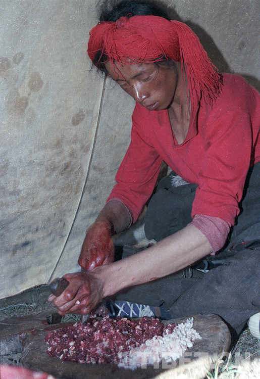 這是班戈縣的一位青年牧民在帳篷里切剁羊肉,準(zhǔn)備灌制肉腸(唐召明1987年攝)