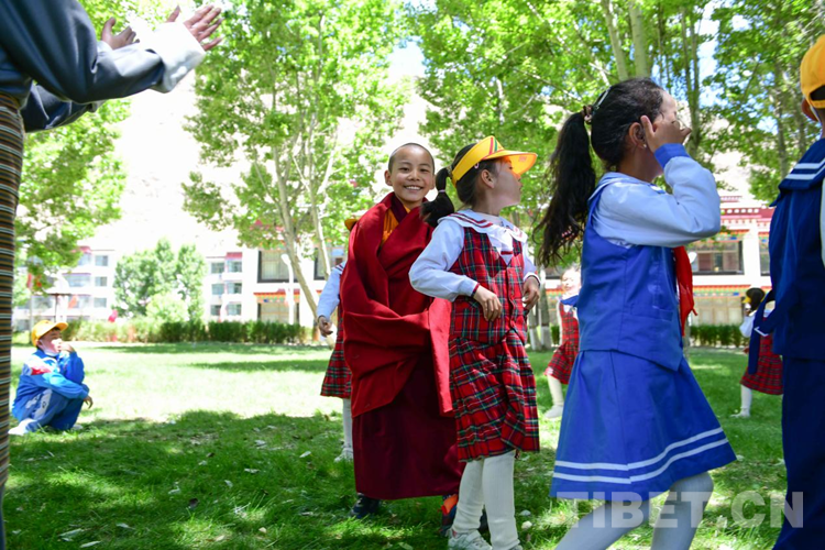 圖為少年活佛與拉薩市第一小學的學生一起做游戲 攝影:拉姆
