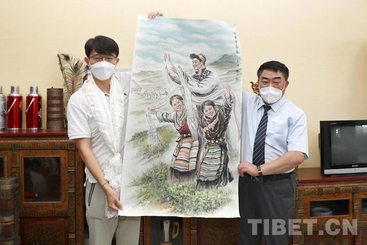 “我愛人看到了咱們館(西藏文化博物館)發(fā)的征稿啟事,然后就把這條信息發(fā)到家庭群里邊。過了不久,我父親說他畫了一張畫,讓我看看畫得怎么樣。我當(dāng)時還很意外,本來想鼓勵我兒子畫一張,結(jié)果我兒子沒畫,老爺子畫得還很好?!?月21日,張兆林先生將自己的作品《哈達(dá)寄深情》捐贈給西藏文化博物館,張兆林之子張安誠將作品送至博物館并收到了捐贈證書。
