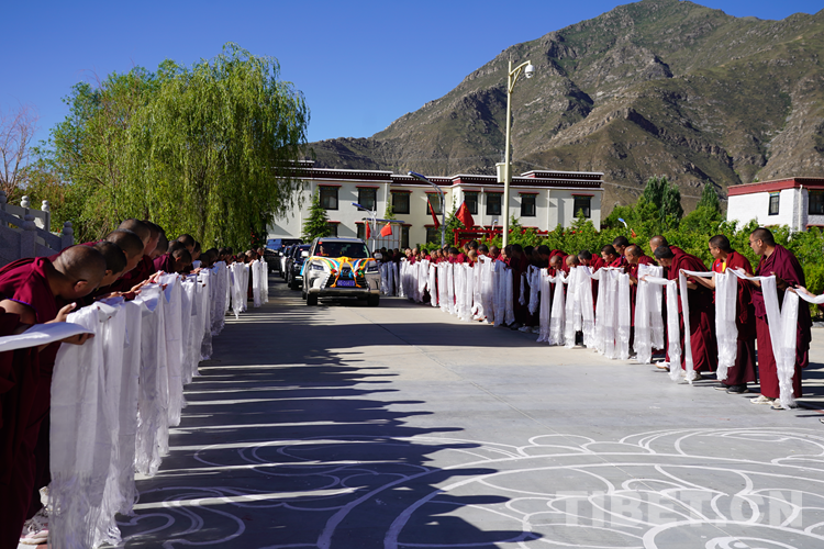 圖為班禪抵達西藏佛學(xué)院,西藏佛學(xué)院全體師生手捧哈達迎接班禪 攝影:王淑