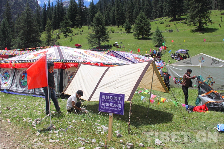 圖為2022年伊日鄉(xiāng)第二屆文化旅游藝術(shù)節(jié)上,前來參加的群眾在搭建帳篷,旁邊是“用好你的手 垃圾無處留”的標(biāo)語 攝影:王茜