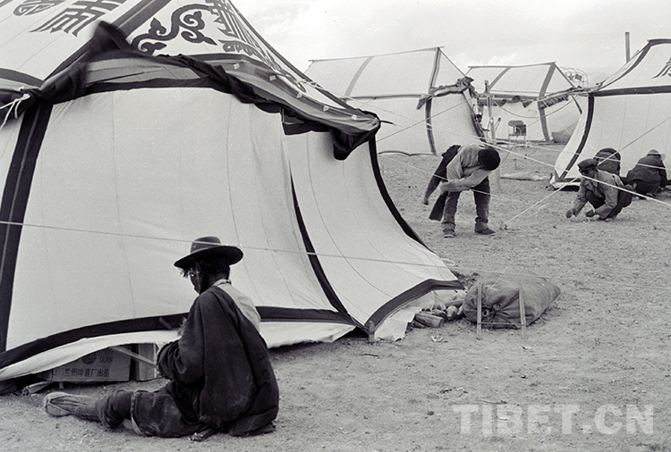 這是那曲地區(qū)文部辦事處(現(xiàn)那曲市尼瑪縣)舉行傳統(tǒng)賽馬會(huì)前,人們臨時(shí)在搭建各家的白色帆布帳篷(唐召明1987年攝)