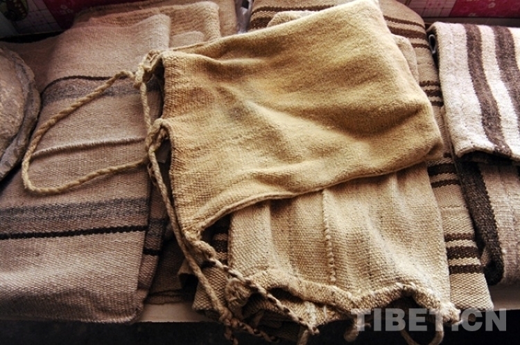 這是藏北草原牧民用牛羊毛所織的氆氌和身背的口袋(唐召明2015年5月21日攝)