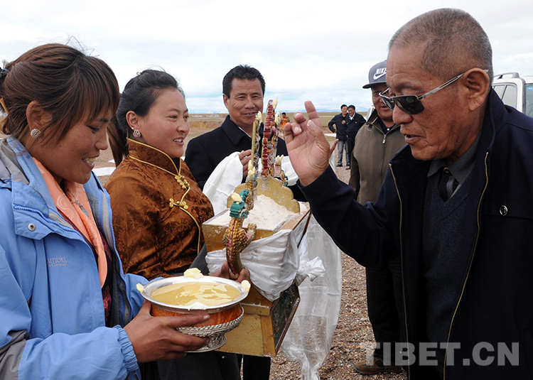 這是那曲地區(qū)雙湖特別區(qū)(現(xiàn)那曲市雙湖縣)女青年使用大銀碗向來(lái)賓敬青稞酒(唐召明2013年7月25日攝)