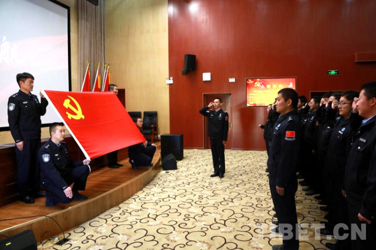 圖為西藏邊檢總站執(zhí)法調(diào)查支隊(duì)組織民警重溫入黨誓詞 攝影:劉明陽