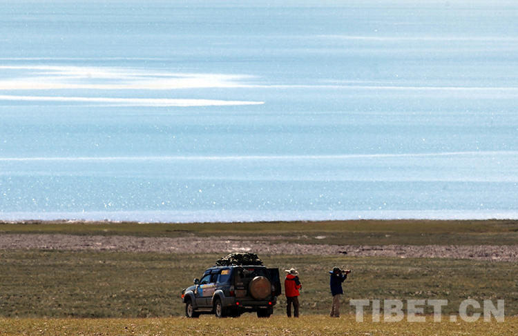 這是自駕游游客在藏北高原一湖泊前游覽(唐召明2009年攝)