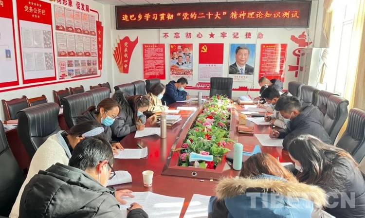 圖為洛扎縣邊巴鄉(xiāng)黨委理論學(xué)習(xí)中心組學(xué)習(xí)貫徹黨的二十大精神并進(jìn)行黨的二十大精神理論知識(shí)測(cè)試。(中國(guó)西藏網(wǎng) 記者/賈華加 圖片來(lái)源:洛扎縣宣傳部)