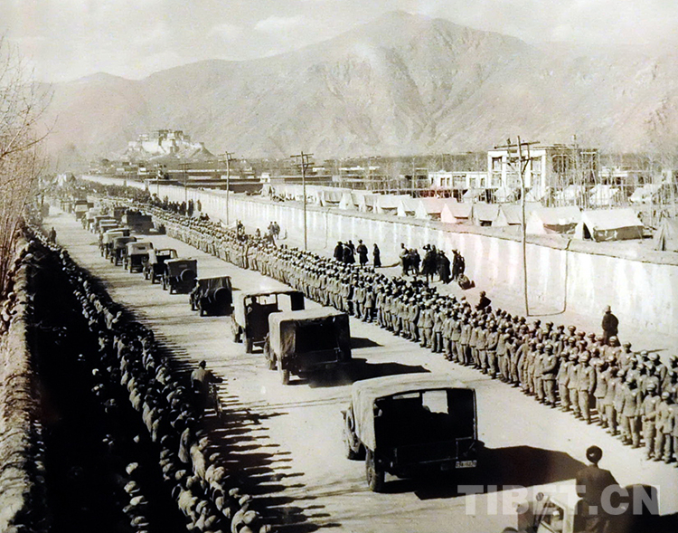 1954年12月25日,汽車第一次開進拉薩。當天,青藏、川藏公路正式通車,兩隊350多輛汽車披紅掛彩會師布達拉宮廣場(唐召明翻拍照片)