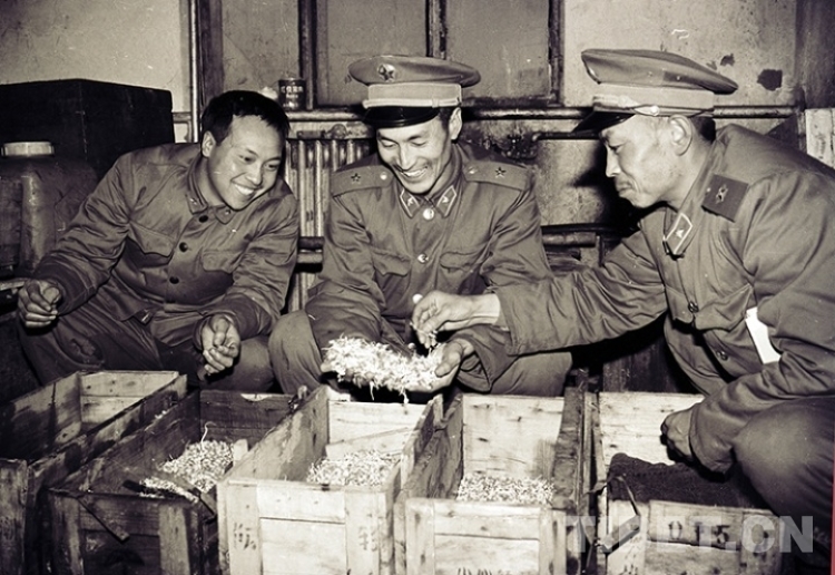 這是青藏公路五道梁兵站官兵在觀看自己新生產(chǎn)出的豆芽。在風雪青藏公路線上,它豐富了過往人員就餐的“菜盤子”(唐召明1987年攝)