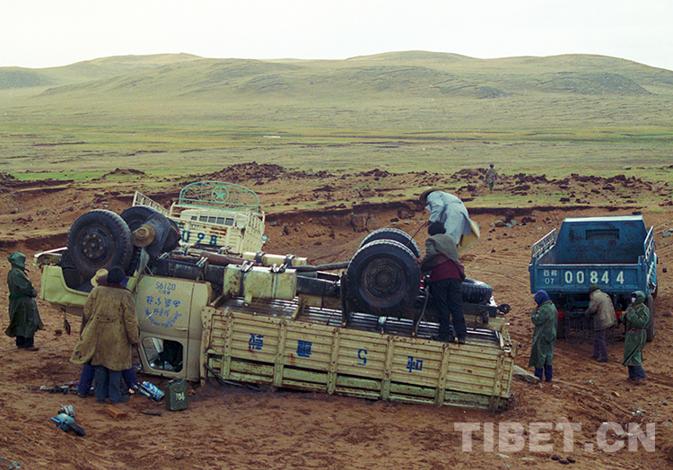 這是作者從西藏調到北京工作,所乘坐的“東風”牌卡車不幸在唐古拉山下翻車,得到了青藏公路安多養(yǎng)護段巴恰等道班工人的鼎力相助(唐召明1991年攝)
