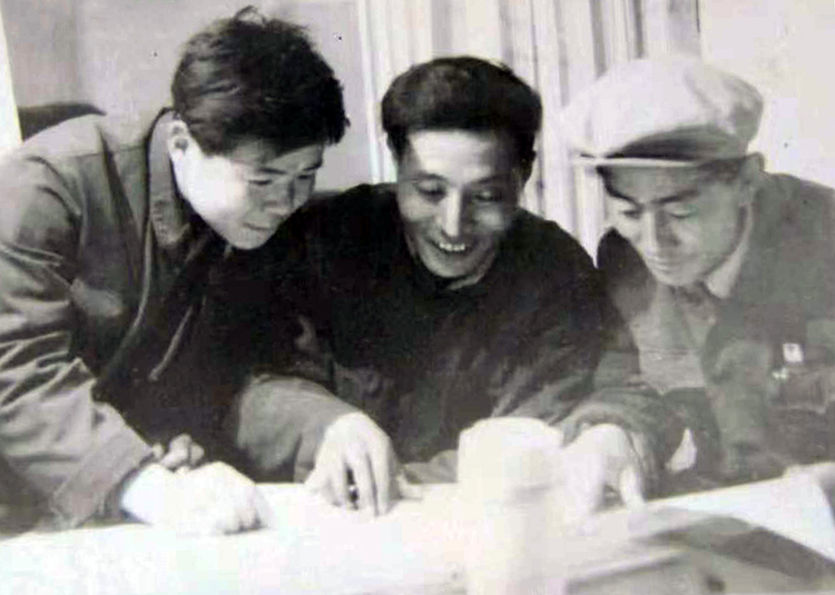 這是李業(yè)壯(左)在那曲地區(qū)農(nóng)機(jī)廠工作時(shí),與藏族副廠長典地(中)、藏族技術(shù)員覺吉(右)一同研究開發(fā)新產(chǎn)品 (唐召明提供,1978年攝)