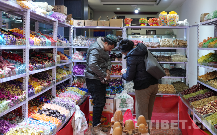 在八廓商城附近的一家門店里,來自新疆當(dāng)?shù)氐暮吞锎髼?、天山沙棗、葉城核桃、大白杏干、馬奶子葡萄干、天山烏梅、巴旦木等,因食材地道、品質(zhì)優(yōu)良格外受到拉薩市民的青睞。老板是位“00”后維吾爾族青年,頭腦靈活,待人熱情,近日來持續(xù)火爆的生意更是讓他高興得合不攏嘴。上門購物的顧客有藏族、漢族、回族等民族,他們除了購買地道的新疆干果,還會購買該店專為藏歷新年新上的大白兔奶糖、彩色硬質(zhì)水果糖、果汁軟糖、巧克力、棒棒糖、藏式奶渣等貨品。人們用漢語加手勢比劃著交流,溝通無礙,再加上移動(dòng)支付方便快捷,老板誠信經(jīng)營,顧客們總能高興而來,滿意而歸。