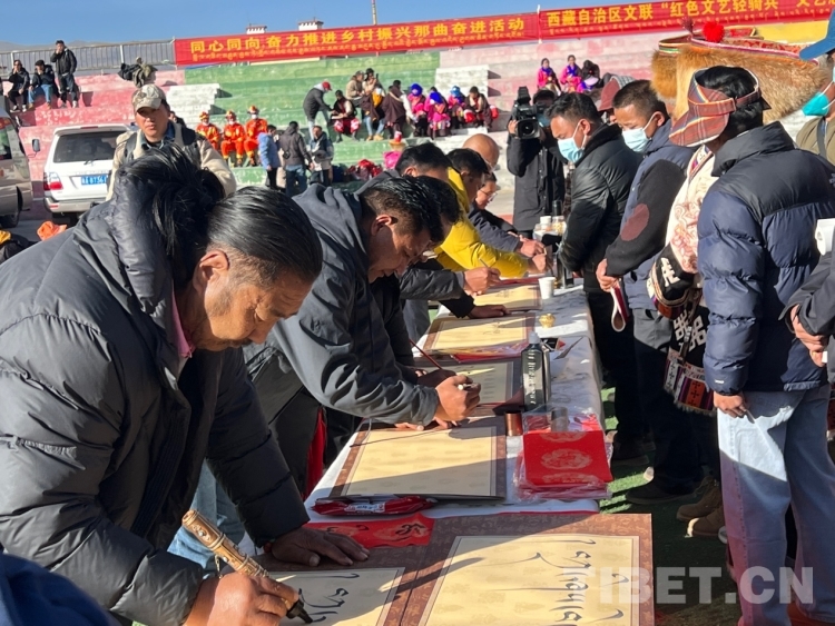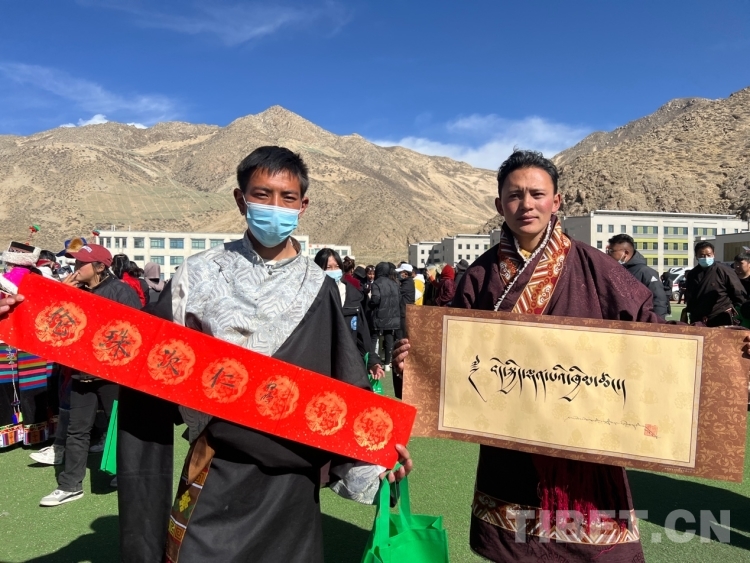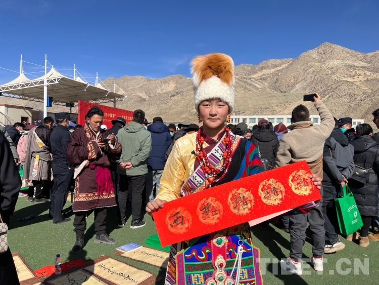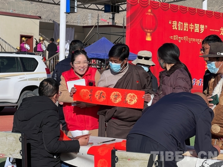中國西藏網訊 2月16日,西藏自治區(qū)文聯(lián)主辦的“我們的中國夢”——文化進萬家活動在極高海拔生態(tài)搬遷安置點開展。在送“書法”現(xiàn)場,由西藏書法協(xié)會和山南市11位書法家為當?shù)厝罕娝腿?00多張寓意美好的新年祝福和群眾期望的新年祝愿等?;顒蝇F(xiàn)場群眾絡繹不絕,大家心滿意足地拿著書法家為自己贈送的精美“禮品”。一旁書法家們忙碌地為群眾書寫祝詞,另一旁群眾們晾曬著他們得到的書法作品,一時間現(xiàn)場成了“書法展”,時不時地有人前來參觀欣賞。(中國西藏網 記者/德吉卓瑪)