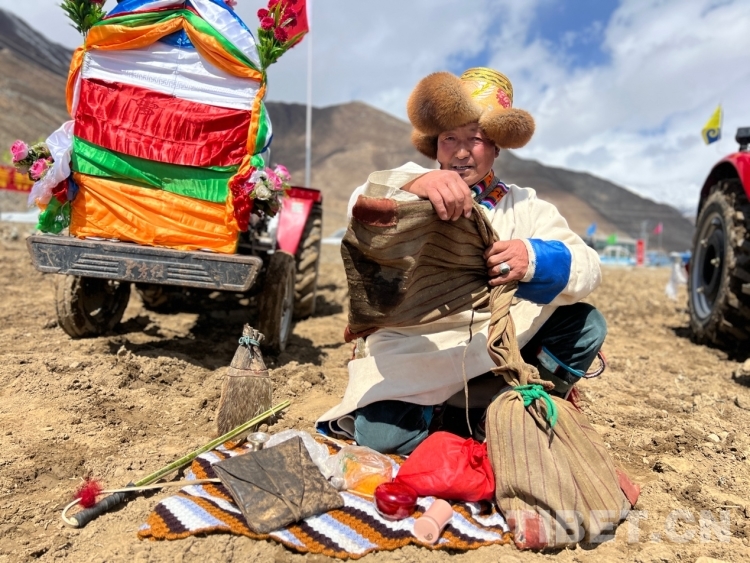中國(guó)西藏網(wǎng)訊 春雪趕赴拉薩,為西藏的春耕儀式“敬獻(xiàn)”一片潔白的吉祥哈達(dá)。大清早,55歲的阿尼換上節(jié)日的盛裝,在牦牛毛編織的包里裝上木碗、糌粑袋、酥油、牛肉等必需品,在藏裝腰帶右邊插上鞭子、左邊掛上趕牛羊的“烏朵”,戴上次仁金果帽(藏帽)走向院子,院子里停放的掛滿五星紅旗、五彩哈達(dá)和鮮花的拖拉機(jī),正是他要在今年的春耕儀式上開(kāi)犁耕耘的“好助手”,他坐上華麗的拖拉機(jī)心滿意足地走向了春耕儀式舉行現(xiàn)場(chǎng)。