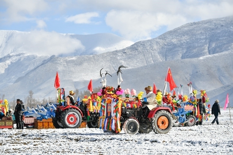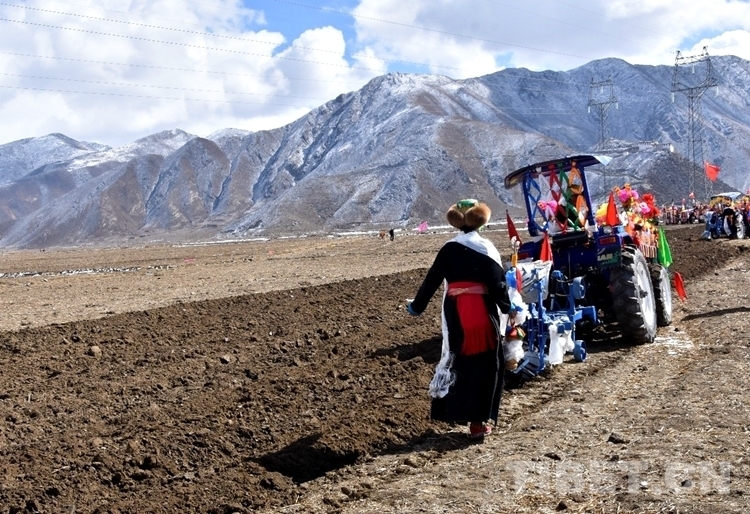 在雪水浸潤過的肥沃土地上,深耕機車輪翻滾而過,駛過的土地上翻起深色的泥土,婦女們跟在后面播撒青稞良種。