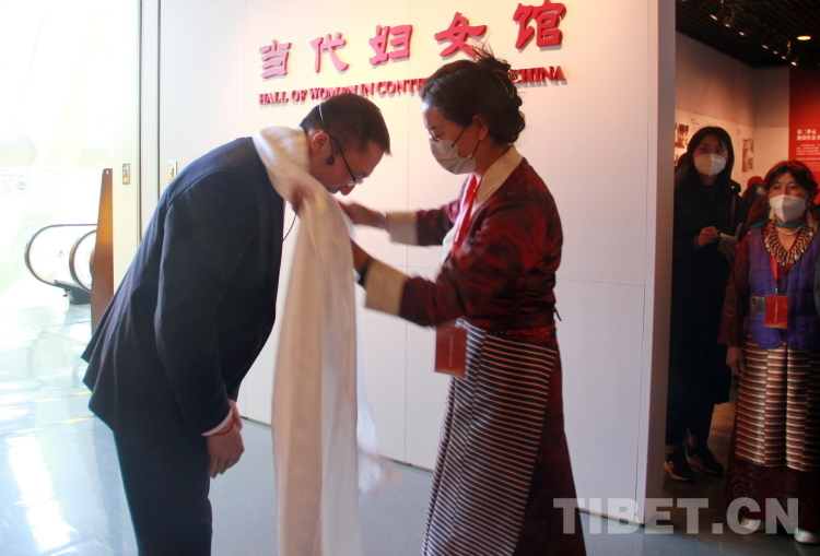 圖為“2023年西藏基層?jì)D聯(lián)干部赴京學(xué)習(xí)參觀團(tuán)”成員向中國(guó)婦女兒童博物館講解員獻(xiàn)上哈達(dá) 攝影:劉莉