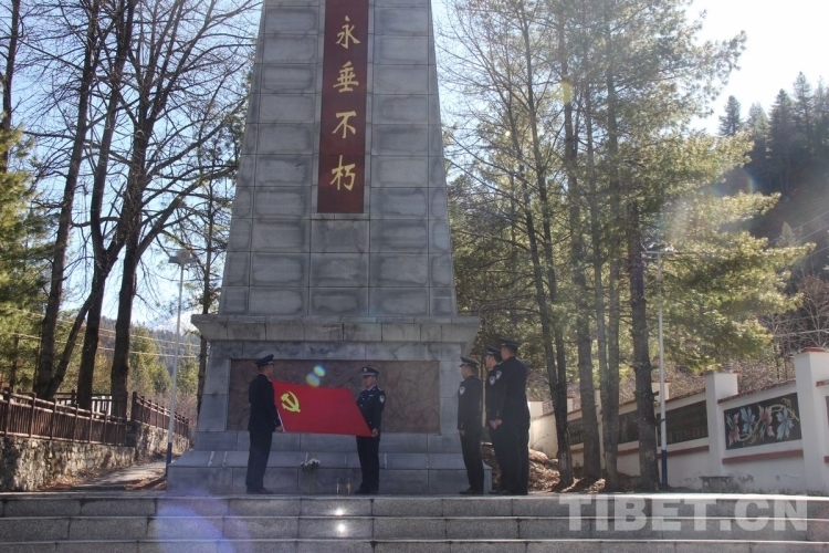 圖為西藏邊檢總站執(zhí)法調(diào)查支隊執(zhí)法調(diào)查七隊民警在亞東革命烈士陵園烈士紀念碑前對黨旗宣誓 攝影:李渠成
