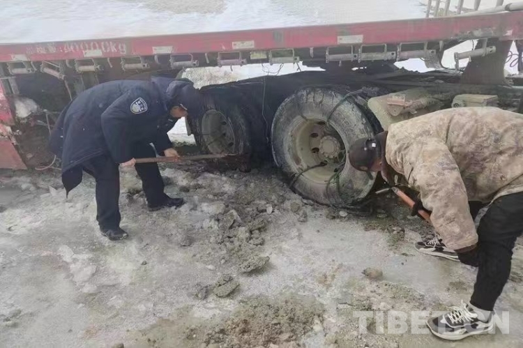 民警抵達現(xiàn)場,首先確認了司機身體狀況良好。在了解情況后,與司機共同對車輛開展救援工作。經(jīng)過一段時間努力,仍無法將被困車輛拖離被困地。經(jīng)與司機協(xié)商決定,先行將其帶至曲松鄉(xiāng)妥善安頓,而后協(xié)調(diào)駐地友鄰單位用重型車輛救援被困車輛。最終在友鄰單位的幫助下,被困近20小時的半掛車成功脫困。