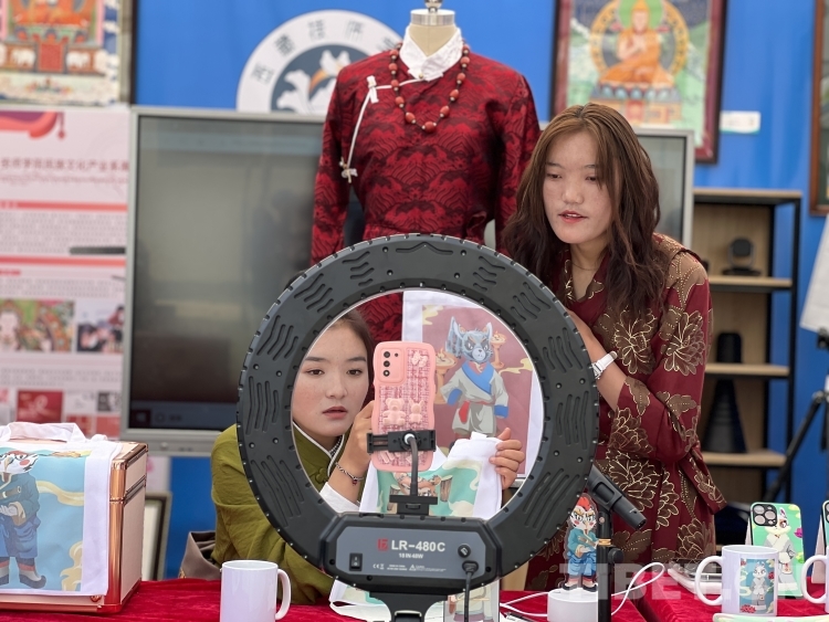 在展示交流區(qū),兩名穿著藏裝的姑娘正在通過直播向觀眾介紹有十二生肖圖案的被子、手機殼、筆記本等各類產(chǎn)品,也吸引著現(xiàn)場嘉賓前來參觀?!斑@些作品是民族文化產(chǎn)業(yè)系學(xué)生的作品,圖案都是學(xué)生自己繪畫的原創(chuàng)文創(chuàng)產(chǎn)品?!蔽鞑丶紟煂W(xué)院數(shù)字信息產(chǎn)業(yè)系教師桑珍介紹,“兩位姑娘是21級電商專業(yè)學(xué)生,通過這次活動一方面希望自己得到鍛煉,另一方面也是為7月份的電商大賽做前期的培訓(xùn)?!?/p>