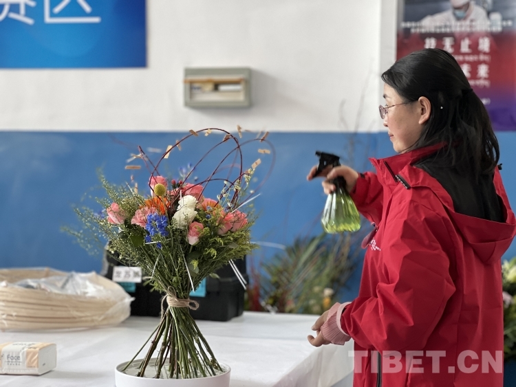 圖為林芝市職業(yè)技術(shù)學(xué)校職工組選手龍?zhí)K娟對自己的花藝作品進行噴水保鮮 攝影:德吉卓瑪