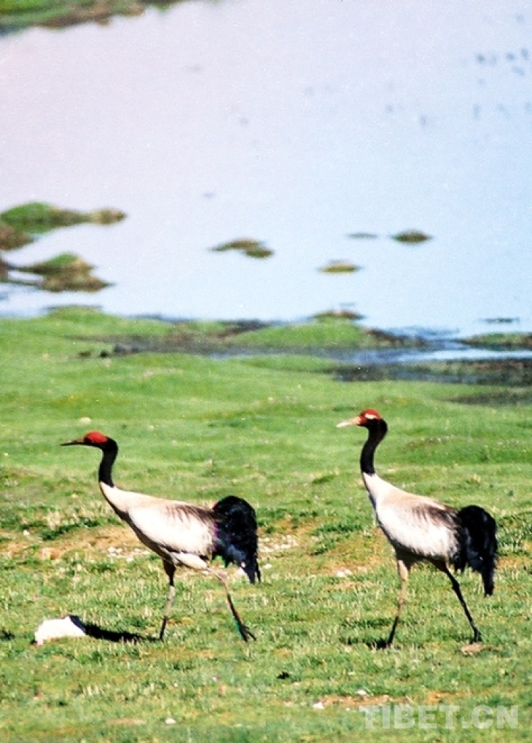 這是兩只漫步在藏北色林錯(cuò)國(guó)家級(jí)自然保護(hù)區(qū)的國(guó)家一級(jí)保護(hù)動(dòng)物、被稱(chēng)為“鳥(niǎo)類(lèi)熊貓”的黑頸鶴(唐召明2001年攝)