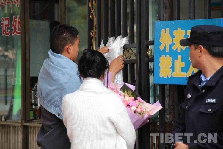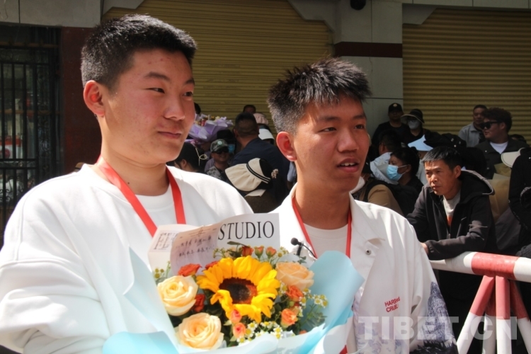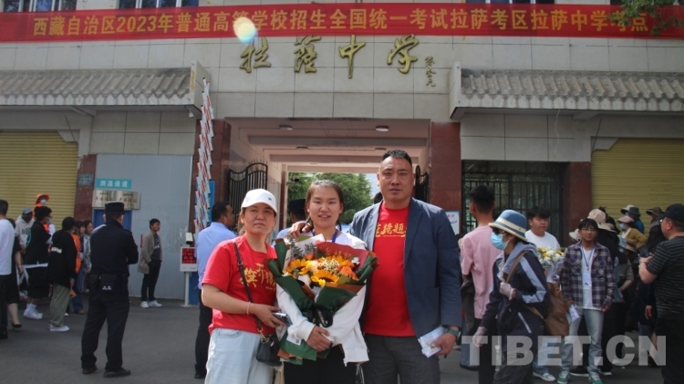 6月8日下午,在拉薩中學(xué)考場外,家長們穿著藏裝、旗袍、印有“金榜題名”“旗開得勝”等加油短袖,手捧鮮花和哈達迎接第一波結(jié)束高考的考生?!敖裉欤|女終于要結(jié)束高中生活了,希望她能如愿考上軍校?!眲?span style="background-color: rgb(255,255,255)">先生夫婦穿著專門為女兒定制的加油短袖,備好鮮花到考場外迎接女兒。像他們一樣,考場外拿著鮮花與哈達、祝賀橫幅、勵志牌等的考生家屬和親戚漸漸多了起來。
