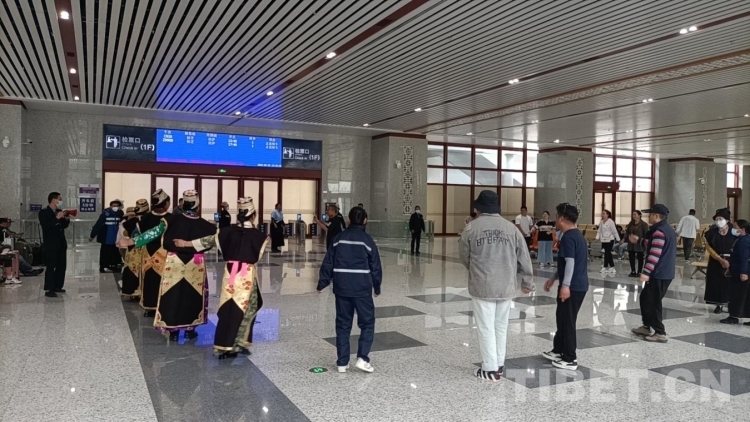 中國西藏網(wǎng)訊 2023年6月25日,拉薩火車站、林芝火車站內(nèi)異常熱鬧。在拉薩火車站,準(zhǔn)備乘坐C925次旅客列車前往林芝的旅客和車站“天路格?;ā狈?wù)隊(duì)的工作人員一起開展著競答互動小游戲,復(fù)興號列車紀(jì)念筆、車站卓瑪工作室卡通形象鑰匙扣、旅行雜志等小禮品深受旅客喜愛。在林芝火車站,工作人員和旅客跳起了熱情的鍋莊,用特有的方式慶祝拉林鐵路開通兩周年。