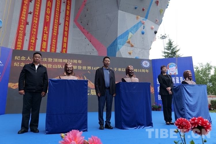 圖為開幕式現(xiàn)場(chǎng)為王富洲、貢布、屈銀華雕塑揭牌 由活動(dòng)主辦方供圖