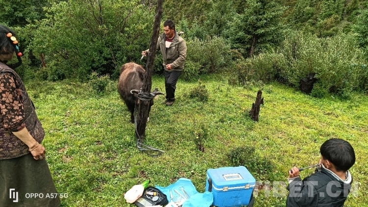 只見那頭受傷的牛被拴在木樁上,尾巴處還帶有一些血跡,顯得非常虛弱。索杰醫(yī)生先是把手術的傷口處仔細檢查了一遍,然后取來藥箱,在傷口處給藥,他告訴牧民家的男主人,?;謴偷眠€可以,不要太擔心,留下的藥是這幾天涂抹和口服的,要按時服用。