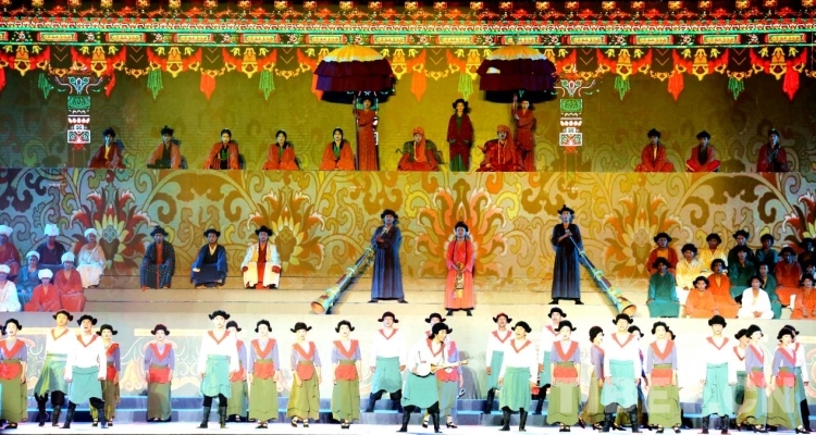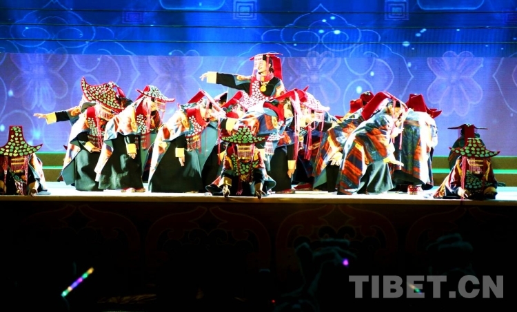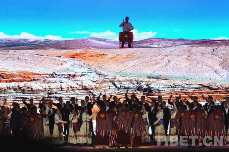 隨后盛大的開幕式文藝演出如期而至。演出共分為《悠遠古韻》《詩意微芒》《如炬經(jīng)典》《輝煌盛世》四個篇章?!队七h古韻》篇章為大型情景表演,結合古格壁畫為開場表演,展現(xiàn)出阿里人民群眾的精神面貌和獨特的阿里神韻?!对娨馕⒚ⅰ穮R集阿里地區(qū)諸多極具代表性的國家級非物質文化遺產(chǎn)節(jié)目,展現(xiàn)阿里地區(qū)悠久燦爛的古代文明遺存?!度缇娼?jīng)典》篇章通過不同舞蹈,展現(xiàn)阿里獨具特色的民間歌舞文化?!妒⑹老腋琛穭t展現(xiàn)了阿里地區(qū)以熱情昂揚的姿態(tài)在全力以赴推動建設雪域高原“西部明珠”中取得的一系列可喜的成績。