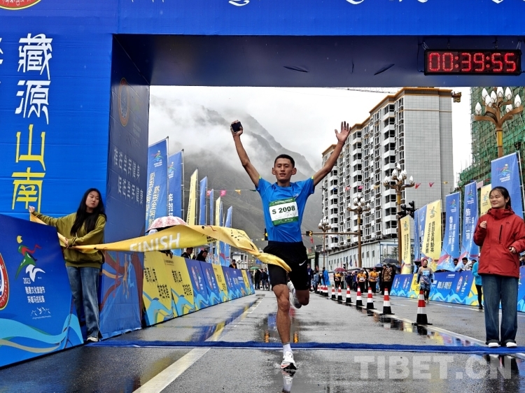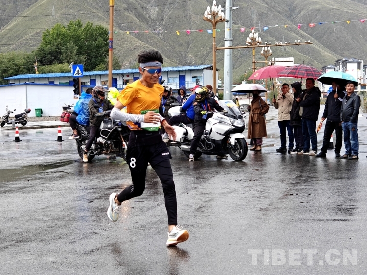 圖為競(jìng)速跑11公里男子組第一名格桑旺堆抵達(dá)終點(diǎn) 攝影:次旦拉姆