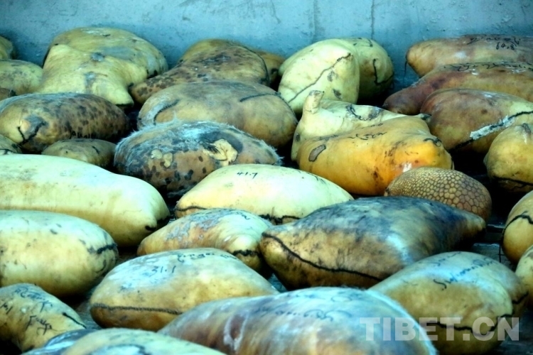 一袋袋用牛羊肚包裹的“酥油磚”整齊碼放在倉(cāng)庫(kù)的一角,黃澄澄、金燦燦。每個(gè)上面寫(xiě)著一串藏文,里面包含了誰(shuí)家生產(chǎn)的,公斤數(shù)、生產(chǎn)日期等信息。