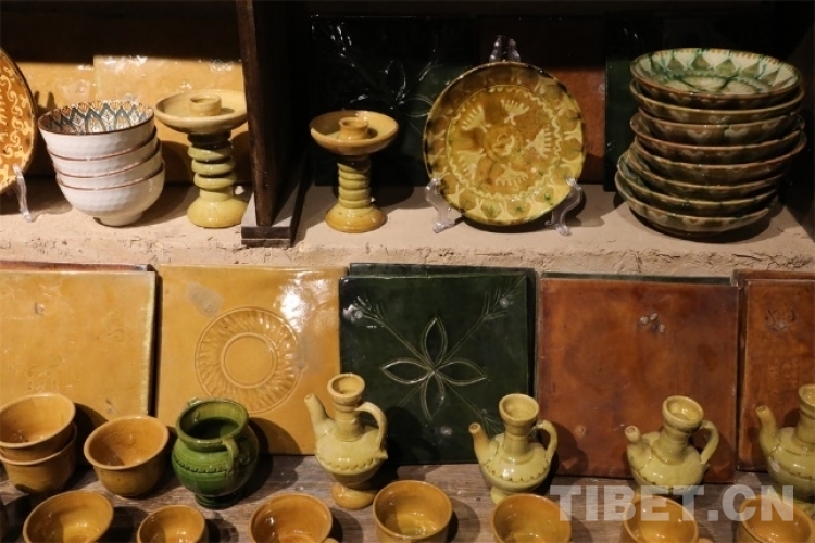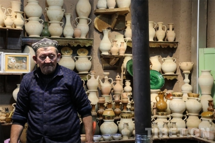 深入高臺民居的內(nèi)部,就可以找尋到現(xiàn)存的土陶人家。步入這個安靜的小院,各式各樣的土陶制品立馬映入眼簾。土陶人家的店主吐爾遜·肉斯塔木是國家級非物質(zhì)文化“模制法土陶燒制技藝”的第七代傳承人,他從17歲開始獨(dú)立工作,如今68歲的他依舊挽起袖管,非常投入地沉浸在土陶工藝的創(chuàng)作世界里。