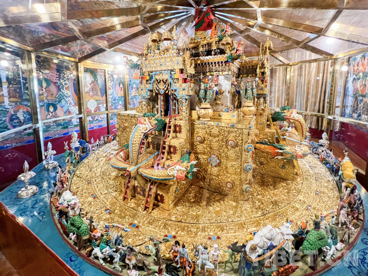 壇城,被稱作“曼荼羅”,是藏傳佛教密宗的重要元素,承載了豐富的象征意義和深刻的修行內(nèi)涵,在藏傳佛教繪畫、寺院建筑、佛塔建筑、宗教法器、佛事活動中被廣泛采用,并形成了固定的模式和種類。 據(jù)扎什倫布寺僧人扎平介紹, “壇城從整體上來講有二維壇城、三維壇城之分,但按其造型形式,表現(xiàn)內(nèi)容和使用材料可分為平面繪畫壇城、立體建筑壇城、彩砂彩粉浮雕壇城等多種類型。我們現(xiàn)在所看到的時輪壇城既是代表人體也是代表宇宙,它的每一個組成部分都與人體有著對應(yīng)關(guān)系。它是用金、銀、銅、木頭等制成的立體法器壇城模型,就像立體的宮殿,這類壇城是作為密宗冥想法器,供陳列和膜拜使用。除此之外,還有金剛密法、喜經(jīng)剛兩座造型各異的壇城。殿堂頂部的壇城壁畫都是僧人以近乎于90度的立體筆觸繪制出來的,其難度可見一斑?!?nbsp;