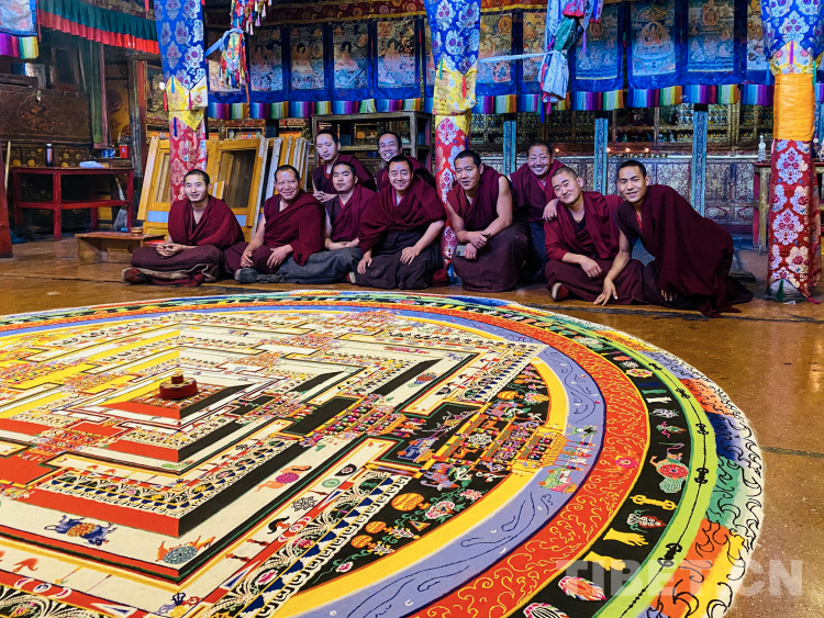 圖為扎實(shí)倫布寺時輪經(jīng)剛彩砂壇城及其繪制僧人 圖片由慈誠提供