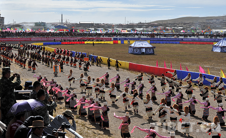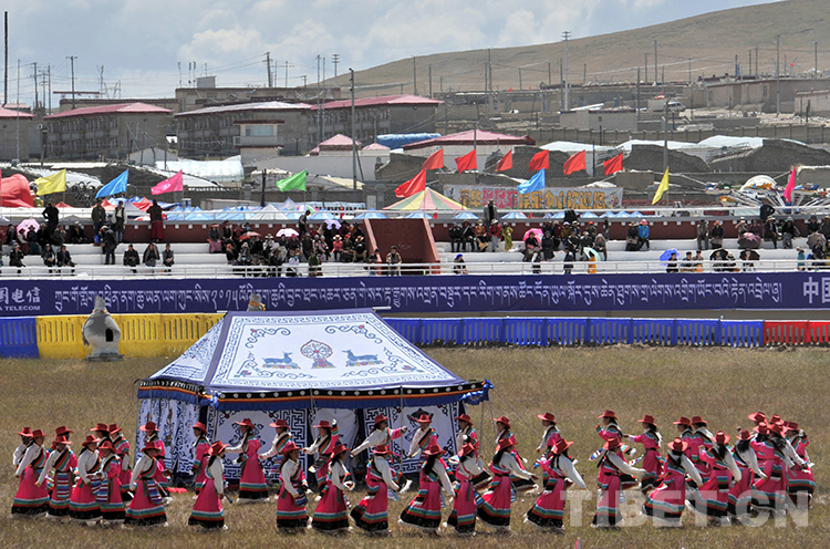 在新改建的那曲賽馬場(chǎng)一角的歌舞表演。當(dāng)日,那曲賽馬節(jié)在藏北首府那曲鎮(zhèn)開(kāi)幕(唐召明2013年8月10日攝)