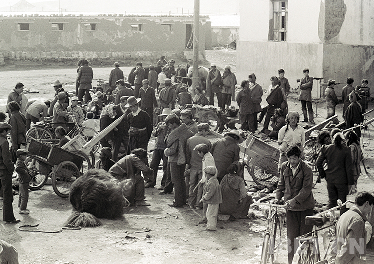 昔日那曲鎮(zhèn)露天市場(chǎng),牧民群眾正在售賣(mài)現(xiàn)場(chǎng)宰殺的新鮮牦牛肉(唐召明1987年攝)