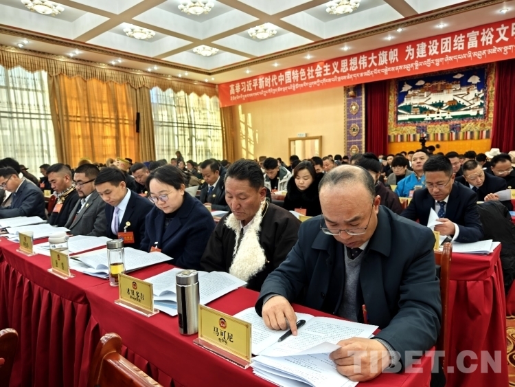圖為政協(xié)委員認真審閱藏文版會議資料 攝影:次旦拉姆