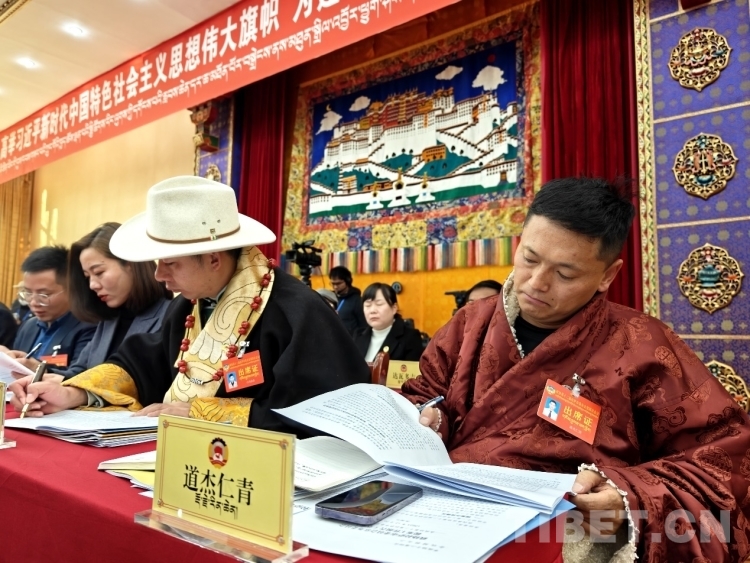 圖為政協(xié)委員認真審閱會議資料 攝影:次旦拉姆