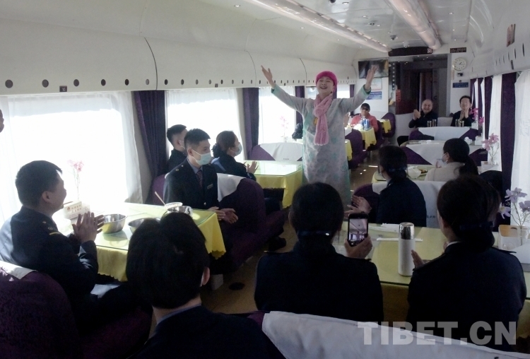 首次進藏的著名歌唱家、協(xié)會公益愛心大使黃春燕在從拉薩到那曲的列車上為“天路”列車員演唱膾炙人口的《天路》之歌(唐召明2023年12月25日攝)
