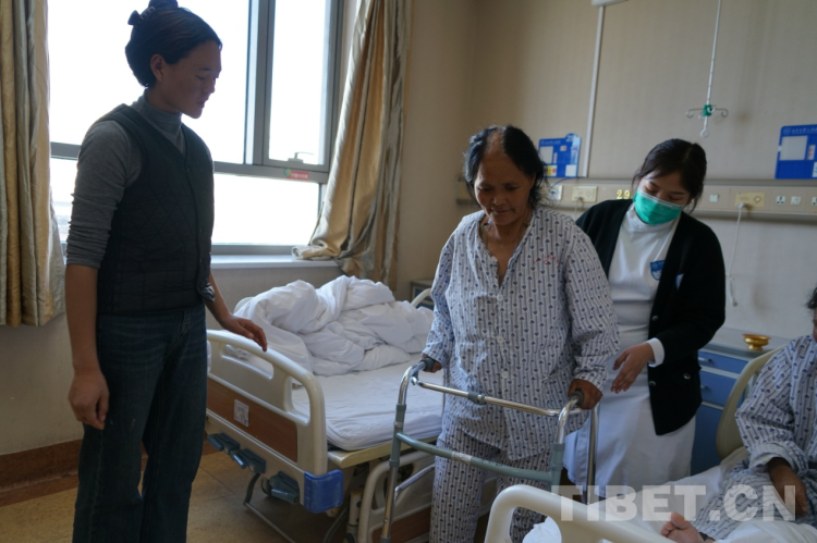 “卓瑪,你快給媽媽翻譯一下,用扶手架轉(zhuǎn)身的時(shí)候90度慢慢轉(zhuǎn),不要一次性轉(zhuǎn)180度,容易摔倒?!惫顷P(guān)節(jié)科護(hù)士薛小英從剛剛的驚慌中回過神來,對(duì)著29床病人布姆的女兒大聲叮囑道。就在剛才,這個(gè)來自洛隆縣59歲的右膝大骨節(jié)病患者布姆在骨關(guān)節(jié)手術(shù)24小時(shí)后,借助扶手架,在護(hù)士的指導(dǎo)下已經(jīng)能夠下床走路了。只是初次使用扶手架還不太熟悉,剛才180度的大轉(zhuǎn)彎讓一旁陪護(hù)的護(hù)士不禁捏了一把汗。女兒卓瑪聽到護(hù)士的話后趕忙告訴媽媽走路轉(zhuǎn)身要慢點(diǎn),小心別摔倒。