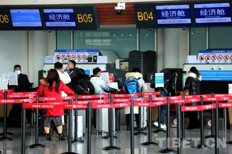 圖為1月26日春運(yùn)首日,拉薩貢嘎機(jī)場(chǎng)內(nèi)旅客有序排隊(duì)辦理登機(jī)手續(xù) 攝影:王佳豪