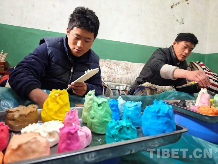 丹增朗杰每天和爸爸、大哥一起從早上8點左右開始捏制,一直持續(xù)到深夜24時許,按圖案復(fù)雜程度,一天可以捏制近7到10余對酥油花。“雖然有點辛苦,但我很喜歡寒假和家人一起來拉薩制作酥油花?!?/span>丹增朗杰說,他從14歲開始學(xué)習(xí)制作酥油花,覺得靠自己的勞動掙錢能讓自己擁有成就感。