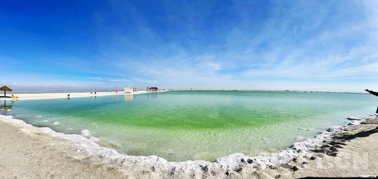 相較于茶卡鹽湖的玲瓏羞赧,作為“亞洲第一鹽湖、世界第二鹽湖”的察爾汗鹽湖便顯得格外浩蕩闊大起來——由達(dá)布遜湖以及南霍布遜、北霍布遜、澀聶等鹽池匯聚而成,總面積5856平方公里,格爾木河、柴達(dá)木河等多條內(nèi)流河注入該湖,有萬丈鹽橋拔地而起,青藏鐵路穿湖而過。湖水呈碧綠色,湖面寬闊浩大,向地平線遠(yuǎn)遠(yuǎn)望去,只見綠浪如山,一望無際,在風(fēng)沙粗糲的茫茫戈壁宛如一塊流落人間的綠寶石。