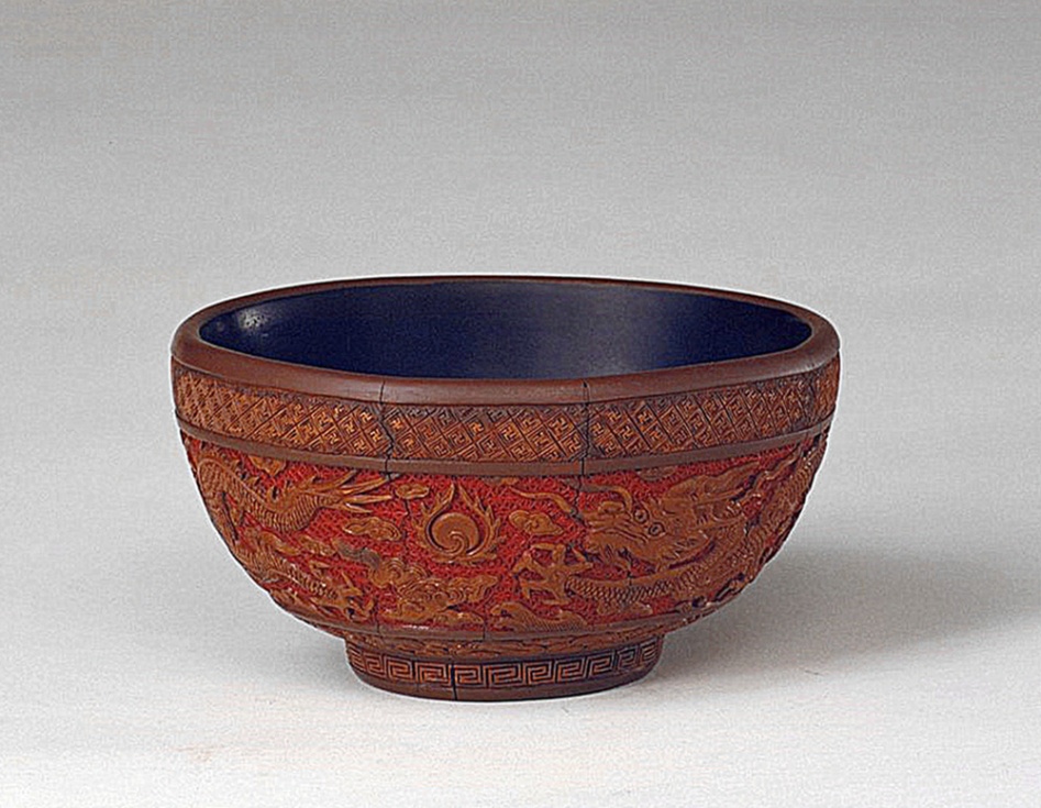此剔黃云龍紋碗,高6.9厘米,口徑13厘米。碗圓口,內(nèi)髹黑漆,直壁下斂接圈足。口外沿及腹下部近足處髹黃漆,雕“卍”字錦、如意云頭紋各一周。腹部以朱漆刻花錦為地,兩條黃色行龍追逐滾動的火珠,雙目圓瞪,活力四射,氣韻生動。碗足內(nèi)有刀刻填金“大明萬歷己丑年制”楷書款,該漆器的龍紋形象以及細(xì)謹(jǐn)?shù)募y飾為萬歷時期雕漆的典型風(fēng)格。(中國西藏網(wǎng) 綜合/周晶)