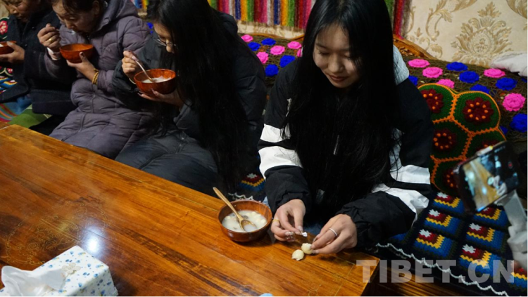 圖為次仁德瓊的二女兒格桑羅吉吃出了帶有“花椒”字條的面疙瘩,寓意“嘴不饒人” 攝影:張曉琪