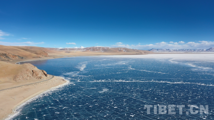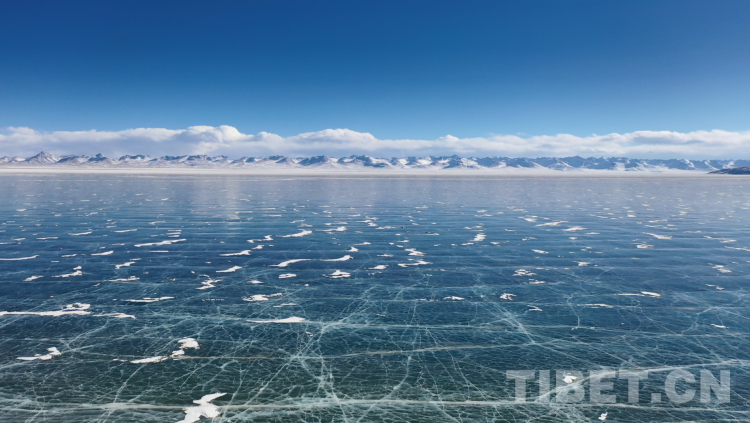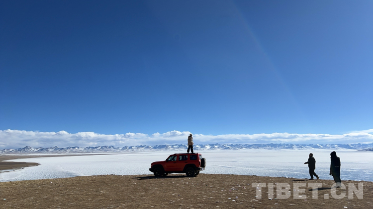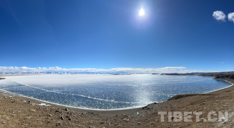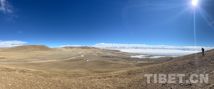 爬上一座山丘,視野陡然明亮開闊起來。原本土黃色的藏北天然牧場(chǎng)高低起伏,黑牦牛零星地散落在山坡,登上高處后,天際圣境納木錯(cuò)便映入眼簾。初春時(shí)節(jié)的拉薩依然春寒料峭,納木錯(cuò)的落雪還未完全消融,站在高處俯視,這片安靜的大湖被陽光反射得白茫茫一片。更幸運(yùn)的是碰到了晴好的天氣,白云與湖冰相襯,亦與遠(yuǎn)山相接,視線盡頭的念青唐古拉山脈直視無礙,畫面猶如“半池白云半池玉”般頗具美感。
